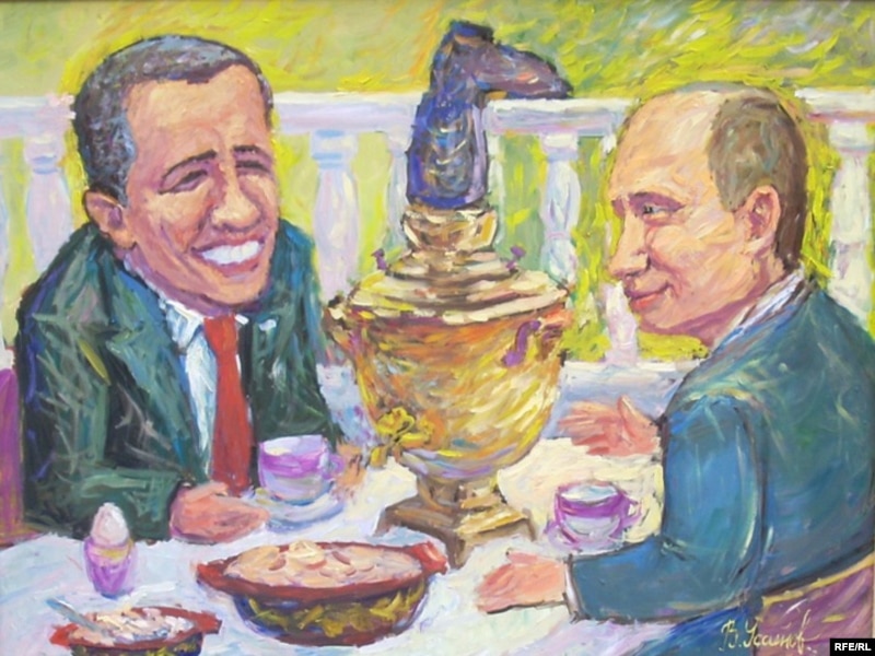 Открытие выставки вятского живописца Владимира Усатова должно было состояться сегодня в областной библиотеке имени Герцена. Однако в последний момент экспозиция была запрещена. Неудовольствие работников библиотеки вызвали два портрета политической направленности. На одном из них изображен американский президент Барак Обама с российским премьером-министром Владимиром Путиным во время их последней встречи в Ново-Огарево. Путин и Обама пьют чай из самовара с сапогом и кушают пельмени.
