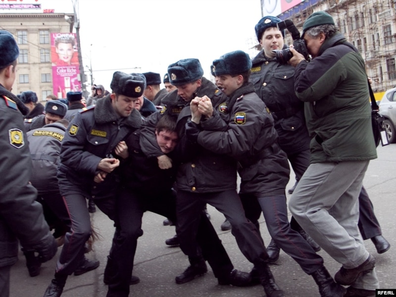 Сотрудники милиции во время разгона акции за свободу собраний на Триумфальной площади в Москве.