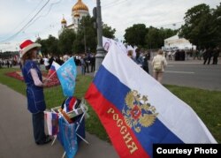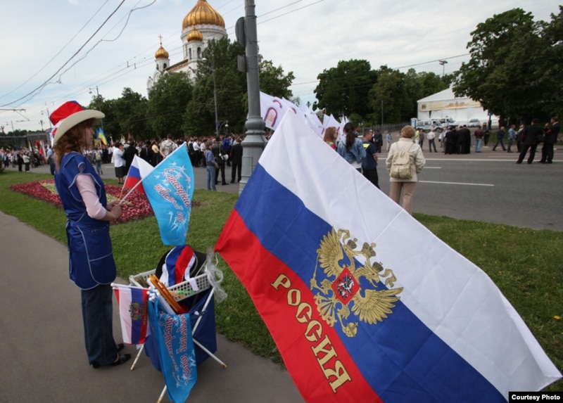 Тут же все желающие могут купить большие флаги и маленькие флажки России. Охраны чуть меньше, чем участников шествия. Все это напоминает нечто среднее между первомайской профсоюзной демонстрацией и Днем города. И ничего не напоминает только об одном - о крестном ходе и равноапостольных святых Кирилле и Мефодии.