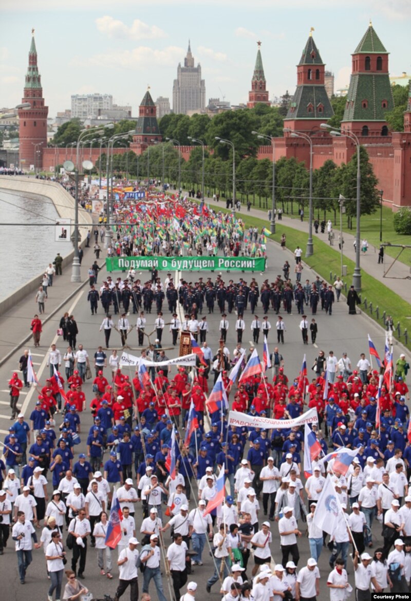 Приезжаю к Храму Христа Спасителя, от которого и должен начаться крестный ход. Гаишник говорит - иди на набережную, строятся все там, только там уже все перекрыто. Действительно, перекрыто, но еще пускают. Действительно, строятся. Представители трудовых коллективов, студенты институтов, представители молодежных организаций, ветераны войны и труда, физкультурники и спортсмены. В конце колонны - представители столичных округов, строго в алфавитном порядке. Возглавляет шествие градоначальник, замыкает большая колонна "России молодой". Звона колоколов не слышно из-за громкой песни "Дорогая моя столица..."