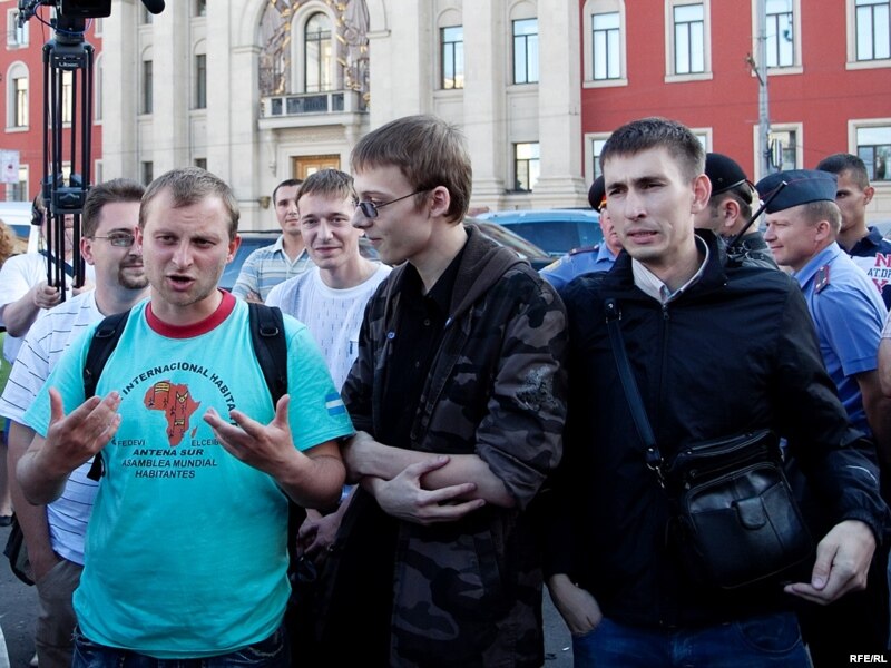 Как только Сергей Удальцов и его соратники достали "черные метки" для Юрия Лужкова, сотрудники милиции приступили к задержанию.