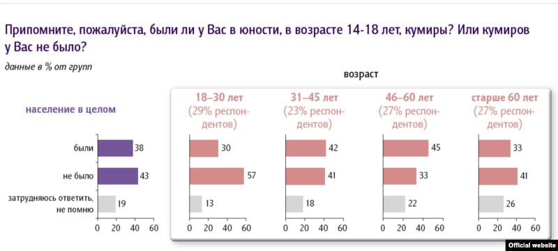 Фонд «Общественное мнение» выяснил, кого считают россияне кумирами своей юности. О наличии таковых в своей жизни заявили тридцать восемь процентов опрошенных. Чаще всего это певцы и музыканты, чуть реже – актеры и спортсмены, еще реже – герои войны и политические лидеры. Почти каждый десятый респондент старше шестидесяти лет называет кумиром своей юности Иосифа Сталина, а тринадцать процентов людей в возрасте от сорока шести до шестидесяти – Владимира Высоцкого. Среди тех, кому от тридцати до сорока пяти, многие в юности восхищались солистами популярных музыкальных коллективов: тринадцать процентов – Юрием Шатуновым (группа «Ласковый май») и десять процентов – Виктором Цоем (рок-группа «Кино».) Среди молодых респондентов более трети называют своими кумирами певцов и музыкантов, как российских, так и зарубежных. Помимо этого, к кумирам сегодняшнего дня молодежь относит спортсменов. Интересно, что подавляющее большинство россиян – пятьдесят восемь процентов – ответили, что кумиров у них не было и нет.