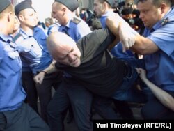 Первого унесли Сергея Удальцова с соратниками по "Левому фронту", которые развернули несколько плакатов в защиту Химкинского леса