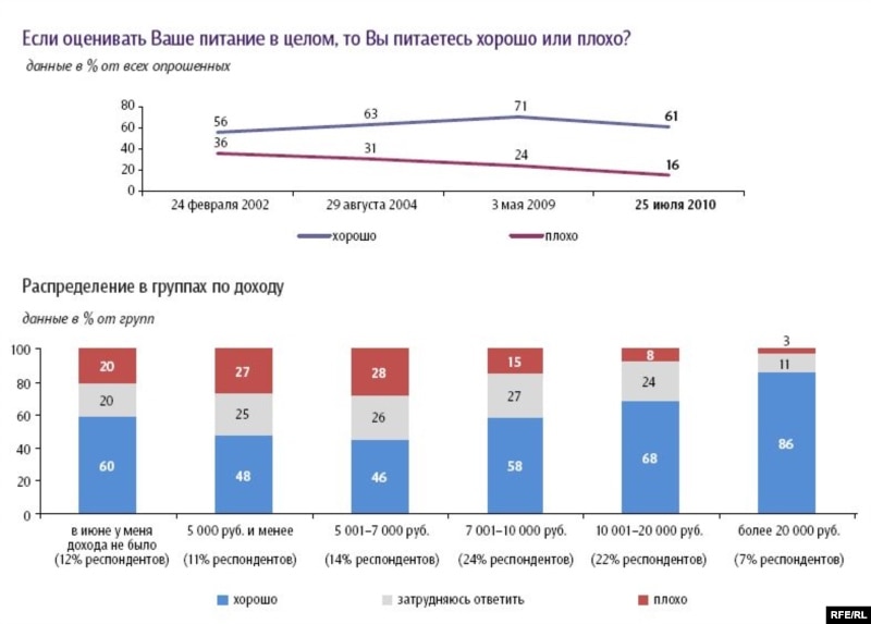 Фонд «Общественное мнение» исследовал, как оценивают россияне качество своего питания. На вопрос «Хорошо или плохо вы питаетесь?» подавляющее большинство, шестьдесят один процент опрошенных, ответили «хорошо».