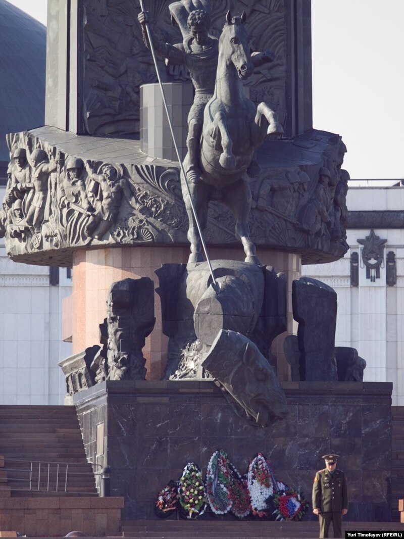 Лошади, символизирующие времена года, скачут по направлению к Кремлю. Композиция в Александровском саду