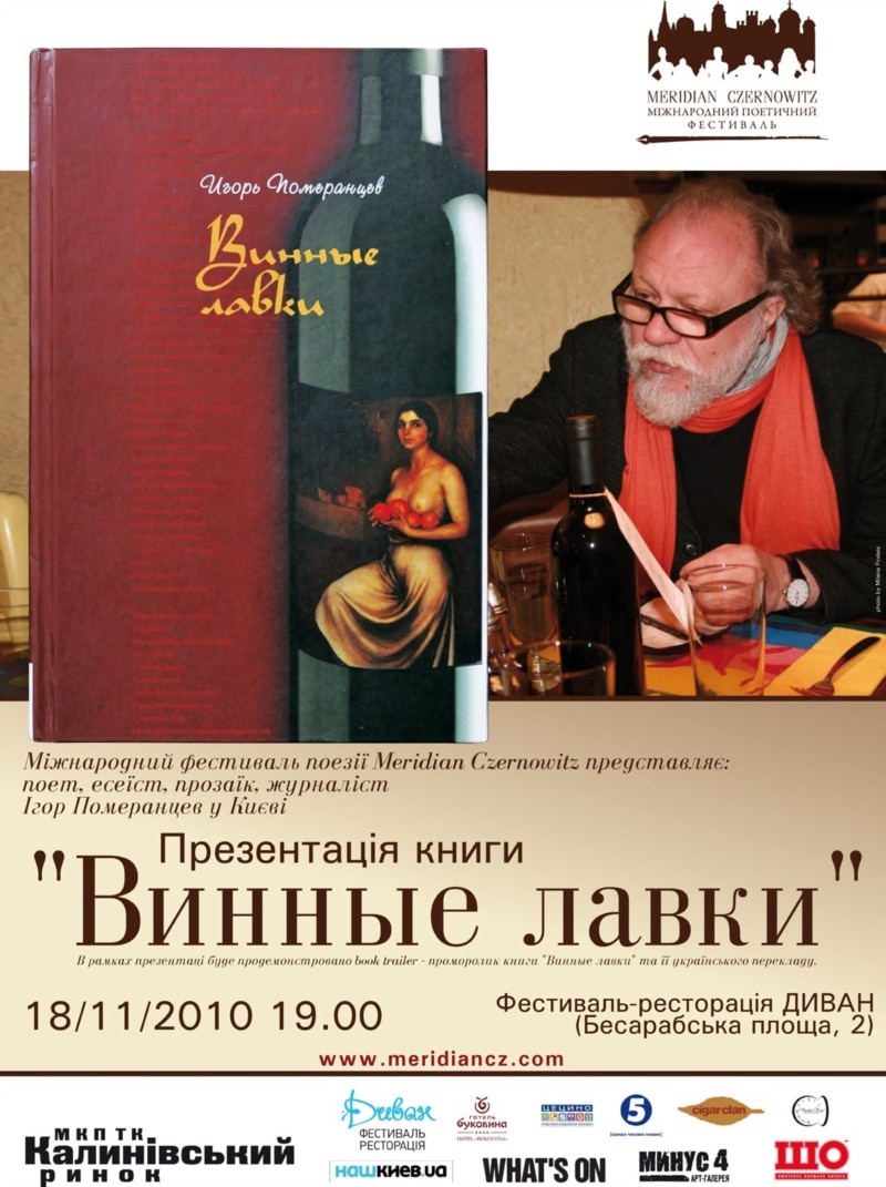В субботу 13 ноября я улетаю на неделю в Киев и в Черновцы: там у меня презентация книги "Винные лавки" (проза, поэзия, эссе). Книга издана при содействии Международного поэтического фестиваля "Черновицкий меридиан". Открывается книга эссе "На заданную тему".