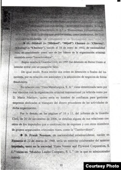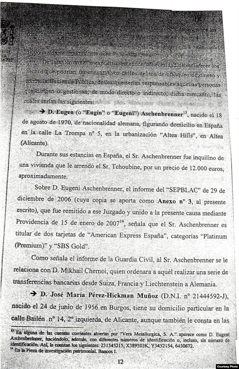 Кроме того, к делу причастны и другие лица, "которые руководили, прямо или косвенно, денежными потоками". Это испанец Хосе Мария Перес-Хикман Муньос, который работал в Vera Metallurgica в качестве финансового консультанта. Он являлся консультантом многочисленных фирм, использованных Олегом Шубиным для отмывания денег, происходящих из криминальной организации, управляемой г-ном Тюриным (Владимир Тюрин, более известный как вор в законе Тюрик, задержан в Москве по запросу властей Испании 2 ноября 2010 года - РС).