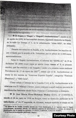"Как свидетельствует отчет Гражданской Гвардии (полиции) Испании, с г-ном Ашенбреннером поддерживал отношения Михаил Черный, который отдал ему распоряжение произвести ряд банковских переводов из Швейцарии, Франции и Лихтенштейна в Германию", - говорится в копии испанского уголовного дела об отмывании денег и преступлений против государственного имущества, оказавшейся в распоряжении РС .