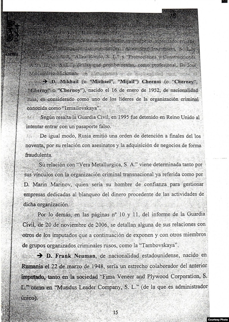 "Г-н Михаил Черной (или Черный) считается одним из лидеров организованной преступной группировки "Измайловская" . Согласно донесениям испанской полиции, в 1995 году был задержан в Соединенном Королевстве при попытке въезда по фальшивому паспорту. Россия выдала ордер на его арест в конце 90-х по подозрению в причастности к убийствам и приобретению бизнеса мошенническим путем. Его отношение к Vera Metallurgica определяется связями с транснациональной преступной огранизацией, связанной с именем Марина Маринова – человека, нанятого для управления предприятиями, занятыми отмыванием денег в связи с деятельностью этой организации", - указывается в документе.
