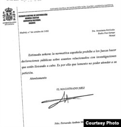 Корреспондент РС направил запрос судье Фернандо Андреу с просьбой об интервью и уточняющими вопросами по делу, в котором фигурирует Олег Дерипаска. Из ответного факса господина Фернандо Андреу следовало, что, согласно испанским законам, судья не имеет право комментировать дело до того, как закончится расследование.