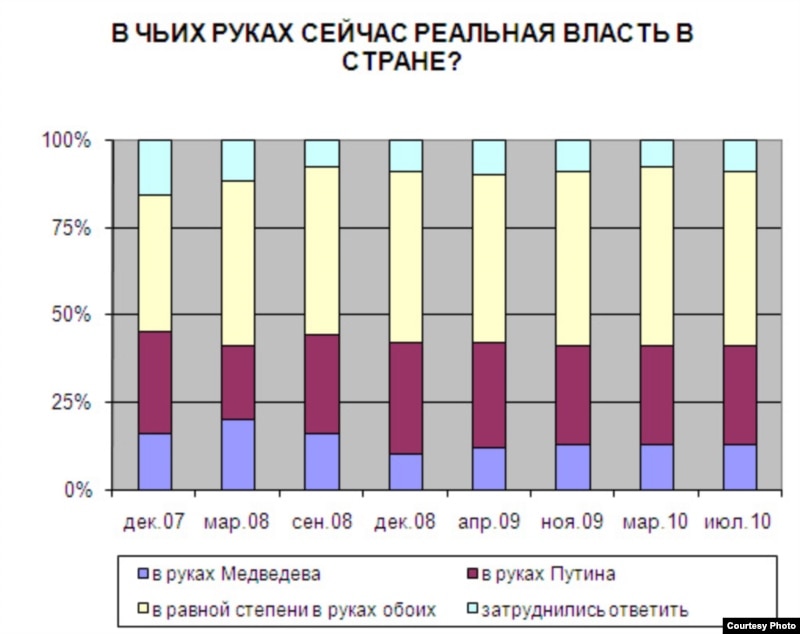 Аналитический центр Юрия Левады исследовал отношение россиян к тандему "Путин-Медведев". По мнению подавляющего большинства, то есть 84 % опрошенных, Владимир Путин, уже не являясь президентом, продолжает оказывать значительное влияние на политическую жизнь страны. Еще 11% говорят о некотором, не столь существенном его влиянии. Но об отсутствии такового заявляют только 2% россиян.
