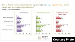 Фонд "Общественное мнение" провел исследование о том, каким видится россиянам будущее: страны, города и семьи в ближайшей перспективе и на несколько лет вперед. Задавались вопросы о том, как, по мнению респондентов, изменится жизнь – в лучшую или в худшую сторону, или же изменений не произойдет вовсе. Более позитивно люди оценивают перспективу на 3 года, чем даже на год, и тем более на месяц вперед. Надежды на изменение жизни семьи радужнее, чем на изменения в стране и родном городе. Оптимистов в сумме больше, чем пессимистов - 38% против 24%. Надежд на лучшее, то есть социального оптимизма, больше у тех, кто полагается в жизни на свои силы, а не на внешние обстоятельства. И именно в группе оптимистов больше всего тех, кто сказал, что за последний год их уровень жизни вырос, а сегодняшний уровень жизни у пессимистов в два раза чаще, чем у оптимистов, оказывается низким. Интересно, что в Москве пессимистов можно встретить чуть чаще, чем оптимистично настроенных.