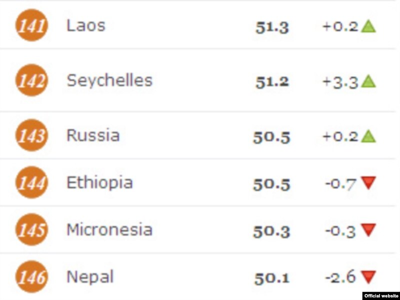Вашингтонский аналитический фонд "Наследие" совместно с газетой "Уолл Стрит Джорнэл" подготовил доклад о степени экономической свободы в 183 странах мира. В этом рейтинге Россия продолжает занимать 143 место.
