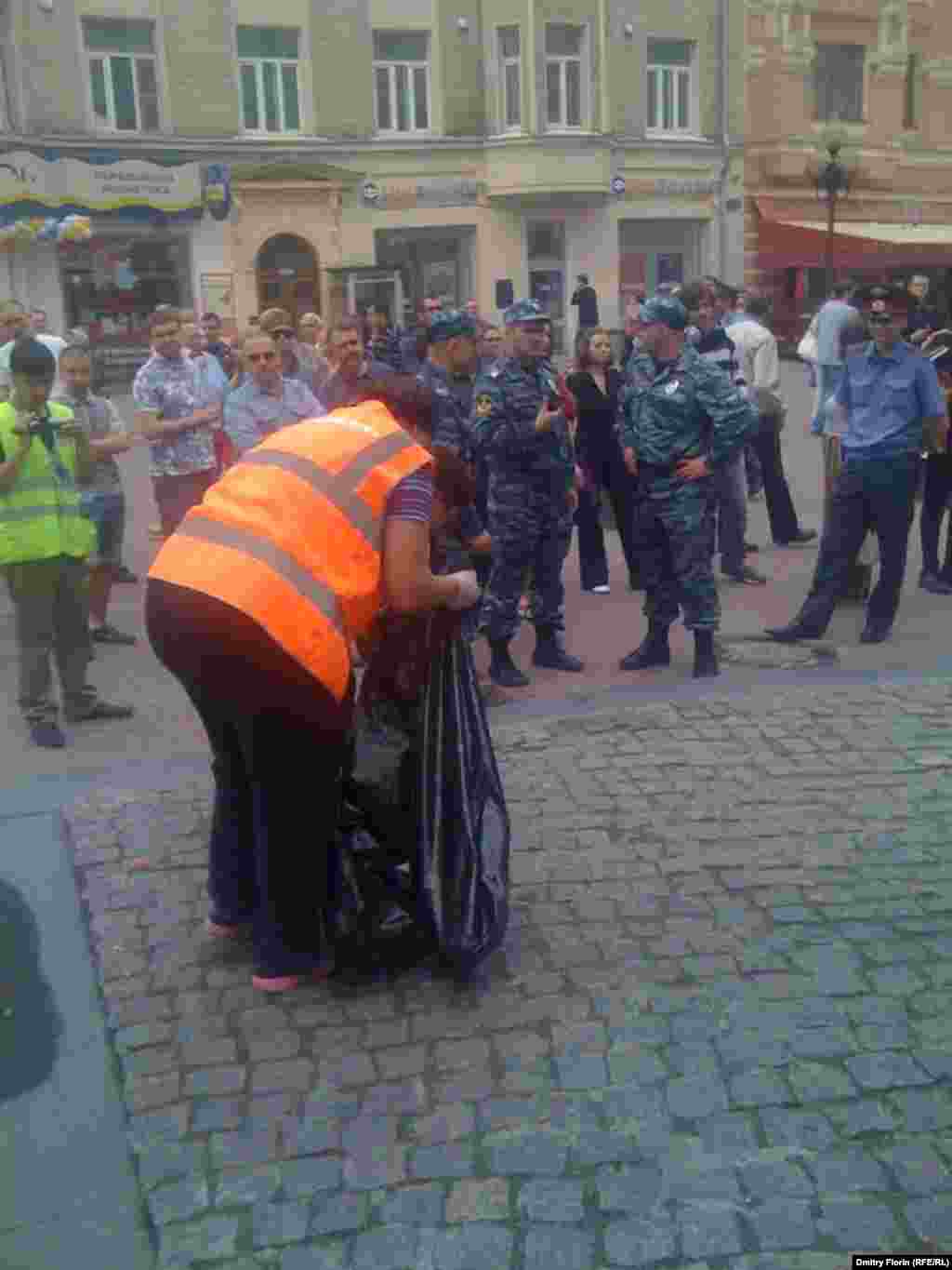 Гражданские активисты на Старом Арбате по очереди зачитывают закон о полиции