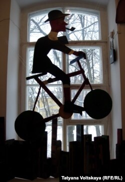 Причем отклик звучит очень ярко и своеобразно: строчки Гора написаны на деревянных плашках, как на шпалах, лицо Хармса, заколоченное досками, как окно дома, покинутого хозяевами. Но мне больше нравится другой Хармс – парящий на велосипеде над городом, над своей зловещей судьбой, откуда он как будто ускользает, и ангел встречает его в небесах. От этой работы веет такой свободой, такой загадочной надеждой, попирающей горькую действительность.