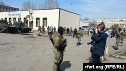 Как сообщает "Остров", про-российские активисты при поддержке "зеленых человечков" (профессионально вооруженных людей без опозновательных знаков) разоружили украинских военных, а технику отогнали за пределы города. Подтверждения информации из других источников нет.