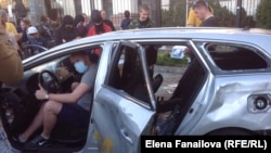 Собравшихся около 300, ядро их составляют молодые люди в масках, именно они разбивают машины российского дипкорпуса.