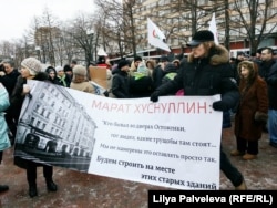 Митинг с требованием отставки руководителя стройкомплекса Москвы Марата Хуснуллина, которого собравшиеся считают главным разрушителем исторической застройки, состоялся на Пушкинской площади в воскресенье. Хуснуллин занимает свой пост с 2010 года – за это время, говорят активисты-градозащитники, в столице были уничтожены 40 ценных памятников архитектуры и множество рядовых старинных объектов. На митинге, организованном партией "Яблоко", присутствовало около трехсот человек.