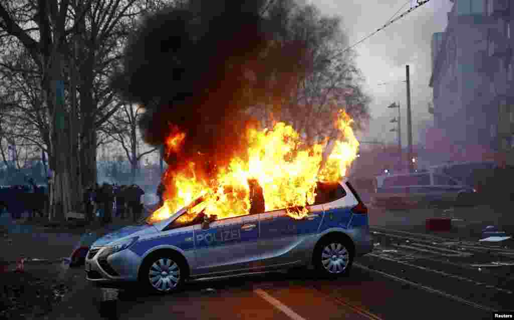 Пожарные тушат один из полицейских автомобилей, подожженных прямо у нового здания Европейского центробанка