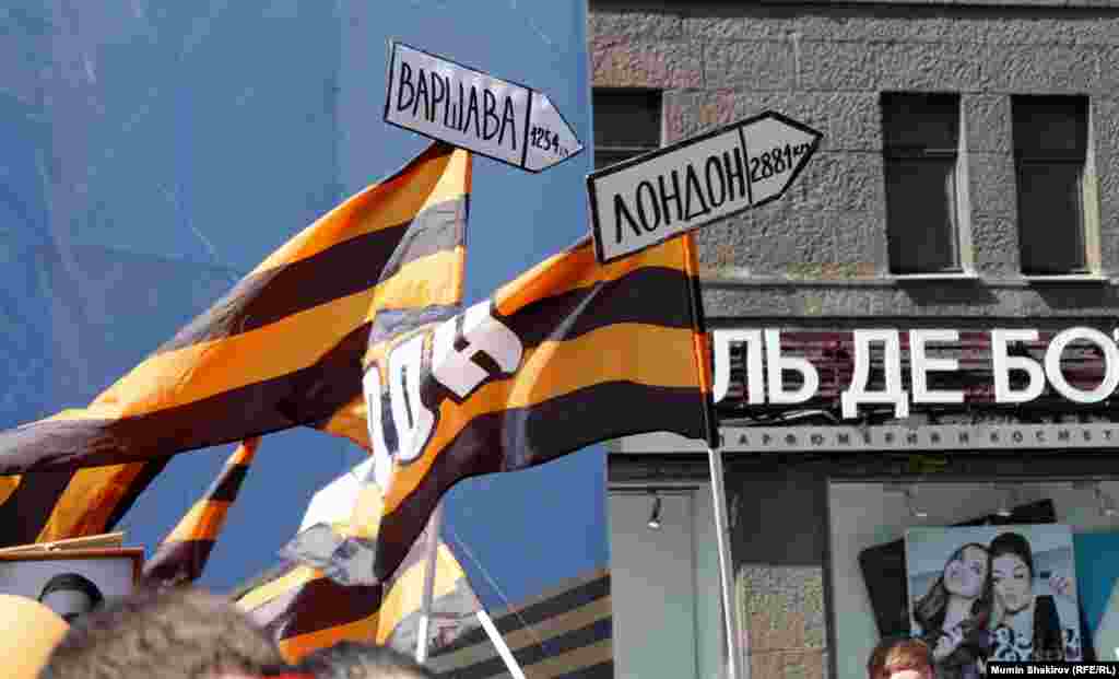 Стенды и плакаты ко Дню Победы разместили по всему маршруту шествия "Бессмертного полка".