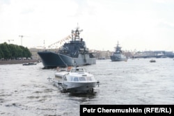 Как сообщает корреспондент Радио Свобода Татьяна Вольтская, впервые в этом году в параде участвуют корабли и подводные лодки нового поколения, среди них фрегат "Адмирал Эссен", корвет "Бойкий", подводная лодка "Краснодар". Почетное место на празднике было отведено вернувшемуся из Кронштадта после двухлетнего ремонта крейсеру "Аврора".
