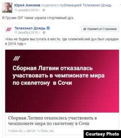 Юрий Аникеев, который родился и вырос в Харькове, ведет сразу несколько аккаунтов в социальных сетях (в ЖЖ, "Фейсбуке", "Твиттере", "ВКонтакте") и нередко дает интервью. Он говорит, что действительно делал репосты записей об аннексии Крыма и конфликте на востоке Украины, однако потом удалил большинство из них. По просьбе Радио Свобода он прислал несколько ссылок на свои записи на форуме shashki.com, в которых, по его собственным словам, "приводил свидетельства российской агрессии и призывал ее остановить". После отстранения себя от чемпионата Европы в Грузии Аникеев разместил пост в "Фейсбуке", сравнив IDF с российскими властями и спортивными чиновниками, обвиненными Всемирным антидопинговым агентством в выстраивании государственной системы приема допинга: