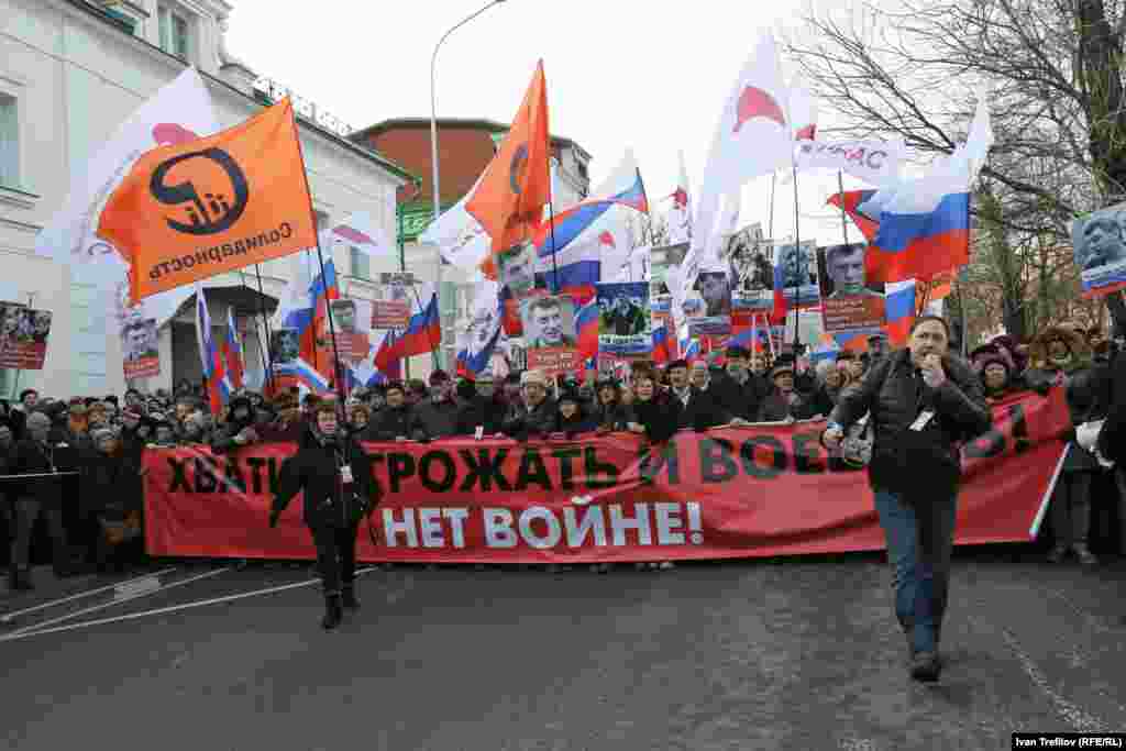 Перед началом Марша полиция изъяла одну из растяжек со словами "Путин - это война"