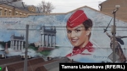 Там, где простора побольше и брандмауэры помасштабнее, возникает иная история – место зарубежной глянцевой рекламы занимают продукты и услуги российского производства, с эстетической отсылкой в советские времена. Даже с учетом ностальгии по юности и стабильности, это не лучший рекламный ход, во всяком случае для тех, кто действительно жил в то время. Похоже, городские власти нашли винтажный чемодан и решили скрасить современность атрибутами прошлого.