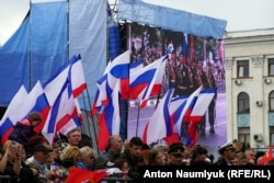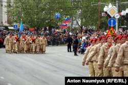 "Россия, Россия!" – кричали тонкими голосами женщины, и дети в пилотках и военной форме советских лет тут же подхватывали. "Вот теперь НАТО поймет, что с нами связываться не стоит, правда?" – девушка, не поворачивая головы, говорит своему молодому человеку, обнимающему ее сзади. Он улыбается и молчит.