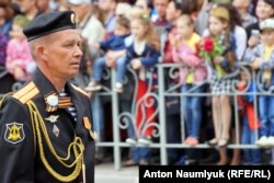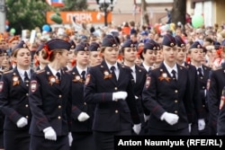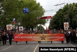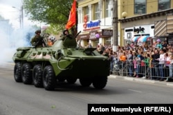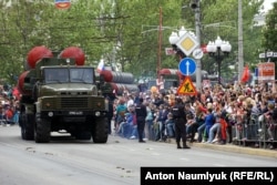 Парад в честь Дня Победы в Симферополе в этом году впервые проводился с военной техникой. По проспекту Кирова проехала колонна из ГРАДов, БТР и баллистических ракет. На броне сидели вооруженные солдаты, но в этот раз лиц не скрывали: махали руками и улыбались. По обе стороны дороги за ограждением и полицейским оцеплением стояла толпа, которая шумела волнами с каждой новой бронированной машиной.