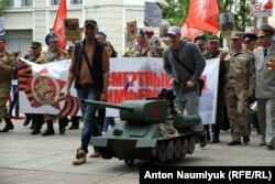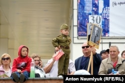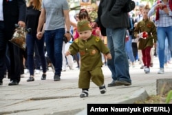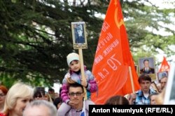 Мужчина с довольным видом толкает перед собой коляску в виде танка, в ней сидит малыш, который мрачно смотрит вокруг. Все стараются сфотографировать картонный танк, мужчина довольно улыбается. Отдельной колонной прошли несколько десятков мужиков в разномастном камуфляже с шевронами народного ополчения Крыма. В руках они несли портреты молодых парней, с датами смерти – 2014 год.