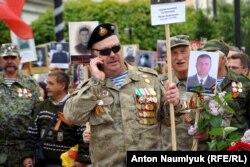 На груди у мужиков болталось по десятку медалей Новороссии. С портретами прошли отдельной колонной коммунисты и полицейские, мужики с бородами с плакатом "Союз офицеров России". Мужчина с длинным хвостом идет в черной майке с портретом Путина. На висок Путина приколота георгиевская лента.