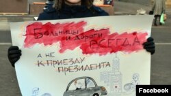 В день приезда Путина в Тверь волонтер штаба Навального Илья Якушев вышел в центр города с плакатом, на котором было написано "Больницы и дороги всегда, а не к приезду президента".
