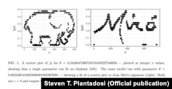 Эти рисунок слона и подпись Жоана Миро "нарисованы" одной и той же элементарной функцией одного параметра fθ(x) = sin2[28xarcsin √θ], только в первом случае этот параметр θ равен 0.2446847266734745458227540656 · · ·, а во втором θ = 0.0024265418055000401935387620 · · · (оба параметра приведены не полностью, они имеют несколько сотен тысяч знаков после запятой). Слон здесь нарисован не случайно, это отсылка к знаменитому "слону фон Ноймана" – высказыванию математика Джона фон Ноймана о том, что с четырьмя параметрами он может описать слона, а с пятым – заставить его махать хоботом. Пьянтадоси показал, что в четырех параметрах нет необходимости – достаточно и одного.