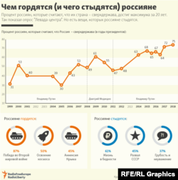 Говоря о гордости за страну, респонденты отмечают события из истории России. Так, победа в Великой Отечественной войне вызывает чувство гордости у 87 процентов россиян. 50 процентов гордятся освоением космоса, 40 процентов – литературой, 37 процентов – достижениями науки. Присоединение Крыма вызывает чувство гордости у 45 процентов респондентов.