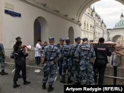 По мере того как демонстранты распространяются по центру Москвы, полиция блокирует улицы. Перекрытая Никольская.