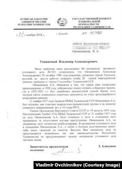 "Мой отец был вольнонаемным шофером при штабе Туркестанского военного округа в Сталинабаде, – рассказывает Владимир Овчинников. – В 1937 году арестовали весь штаб, и его в том числе – по подозрению в содействии, потому что он начальство возил на машине. Якобы троцкистско-анархистская группировка была в этом штабе. Отец сам не видел никакого уголовного дела, подробностей не знал. 18 лет он провел на Колыме, 10 лет по приговору плюс 8 лет вольнонаемным. Его реабилитировали в 1955 году. Я пытался найти его дело, чтобы посмотреть, что собой представляли эти обвинения. Писал во все инстанции, запрашивал, где находится дело. Следы путаются, то в Новосибирске, то Москва отвечает... В конце концов сказали, что дело находится в Душанбе, в Комитете национальной безопасности Таджикистана. Но мне его не дали, выдали только короткую справку.