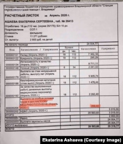 Героиня фильма Радио Свобода о врачах "Важные люди" фельдшер владимирской скорой помощи Екатерина Ашаева прислала в редакцию расчётный листок по своей зарплате за апрель – чтобы проиллюстрировать обещанные президентом выплаты медработникам за работу с коронавирусными больными. В конце марта бригада Ашаевой госпитализировала пациента с подозрением на коронавирус. Поскольку должной защиты у сотрудников не было, Екатерину с коллегами отправили на двухнедельный карантин (муж Екатерины, врач скорой помощи Станислав Ашаев всё это время вынужден был жить в "недостроенной ипотечной квартире"). В конце апреля пришли президентские выплаты: 259 рублей 42 копейки. Как посчитала Екатерина, 2,44 рубля за каждую минуту, проведённую с коронавирусным больным.