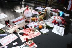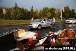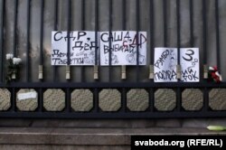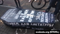 Вот такие послания и "подарки" участники марша в Минске оставили рядом с Дворцом Независимости, когда дорогу им преградил ОМОН. Среди них был гроб с надписью "Диктатор – политический труп", а также траурные венки.