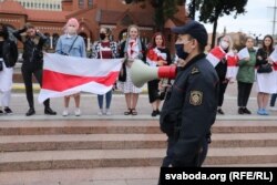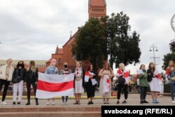 Группа девушек встала в цепь на площади Независимости. Милиция через мегафон предлагает им разойтись.