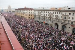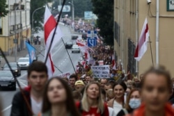 Тысячи людей, проходя мимо здания МВД, скандируют: "Караева в тюрьму!" (Юрий Караев – министр внутренних дел Беларуси. – Прим. РС). Возле здания КГБ в Минске люди скандируют: "Не забудем – не простим", "Трибунал!", "Свобода!", "Освободи!"