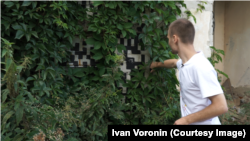 Никита показывает не закрашенную, но исчезнувшую работу серии. За плотной зелёной стеной плюща – огромный QR-код. Это цифровой пропуск, который Никита оформил, когда шёл в этот двор заканчивать работу. Весной стена была свободна от зелени, сейчас код, как и его оригинал, исчезли за ненадобностью, отмечает художник.