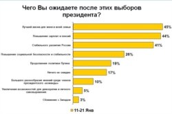 От президентских выборов россияне ждут, прежде всего, «лучшей жизни для себя и своей семьи» (45%), «повышения зарплат и пенсий» (44%), «стабильного развития России» (41%) и «повышения социальной безопасности и стабильности» (26%).