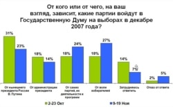 Уверенность россиян в том, что указания и поддержка президента имеет решающее значение для исхода голосования, выше, чем это было в период парламентских выборов (сегодня такой вариант ответа выбрали 47% опрошенных). В октябре 2007 года лишь 31% респондентов говорили о том, что именно от Владимира Путина зависит, сколько партий пройдет в парламент.