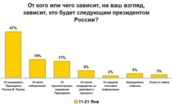 В вопросе «От кого или от чего зависит, кто станет следующим президентом России?» абсолютное большинство (47%) указывает на Владимира Путина. На долю «самих кандидатов, их действий и программ» и «волю избирателей» приходится в общей сложности 16% ответов. Наибольшую «доверчивость» отличаются женщины (21% против 16% у мужчин), люди с образованием «средним» и «ниже среднего», то есть группы, которые в большинстве своем наиболее подвержены влиянию штампов пропаганды, люди, не обладающие ресурсами для критической оценки действительности. Если проанализировать вопрос в разрезе политических предпочтений, наиболее пессимистически оценивают свои электоральные возможности сторонники КПРФ (19%), чаще уверены в победе своего кандидата сторонники «Единой России» (32%) и Жириновского (28%).