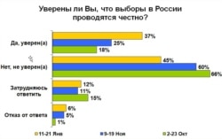 Количество тех, кто считает предстоящие выборы «честными» (37%), несколько ниже количества уверенных в обратном (45%). Если сравнивать текущую ситуацию с тем, парламентской избирательной кампанией, то можно видеть, что уверенность в честности предстоящих выборов уверенно росла с 19% в октябре к 23% в ноябре 2007 года, достигнув максимума в январе 2008. Это можно объяснить поступательным действием пропаганды, развернутой в государственных СМИ.
