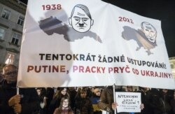 Среди плакатов, с которыми пришли участники митинга, был и один, напоминавший о событиях 1938 года, когда благодаря политике умиротворения агрессора часть территории Чехословакии была оккупирована нацистской Германией. "На сей раз никаких уступок. Путин, убери лапы от Украины!" – значится на плакате.