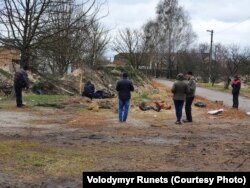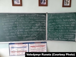 Журналист Владимир Рунец опубликовал фотографии еще из одного освобожденного украинской армией города Киевской области, Катюжанки. На одной из них полиция выкапывает из земли тела мирных жителей, убитых на улицах. На второй – надпись на классной доске в местной школе, куда командующий Восточным военным округом Александр Чайко прилетал вручать награды 24 марта. Учителя и директор школы Микола Микитчик утверждают, что подобные тексты были написаны на досках сразу в нескольких классах.