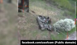На фото ниже – последний кадр, сделанный дроном. Впрочем, по видео сложно судить, поразил ли летательный аппарат цель (российский танк).