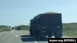 Издание Крым.Реалии публикует фотографии колонны грузовых автомобилей с украинскими номерными знаками, замеченных в аннексированном Россией Крыму на въезде в город Керчь.